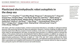 北京时间2025年8月14日国际学术顶刊《科学·机器人》《Science Robotics》杂志发表李国瑞课题组最新研究进展“塑化电液软体机器人深海自主翱翔”(Plasticized electrohydraulic robot autopilots in the deep sea)...